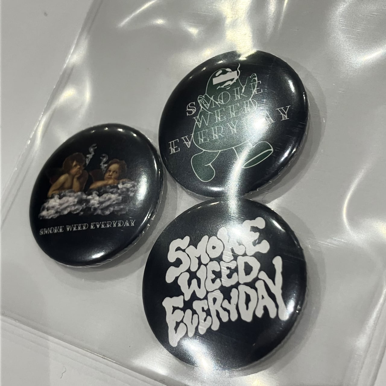 SMOKE WEED EVERYDAYの缶バッチセットです。 新ロゴを交えた3種セットとなります。 CAPやBAGに付けると◎ SIZE:32mm