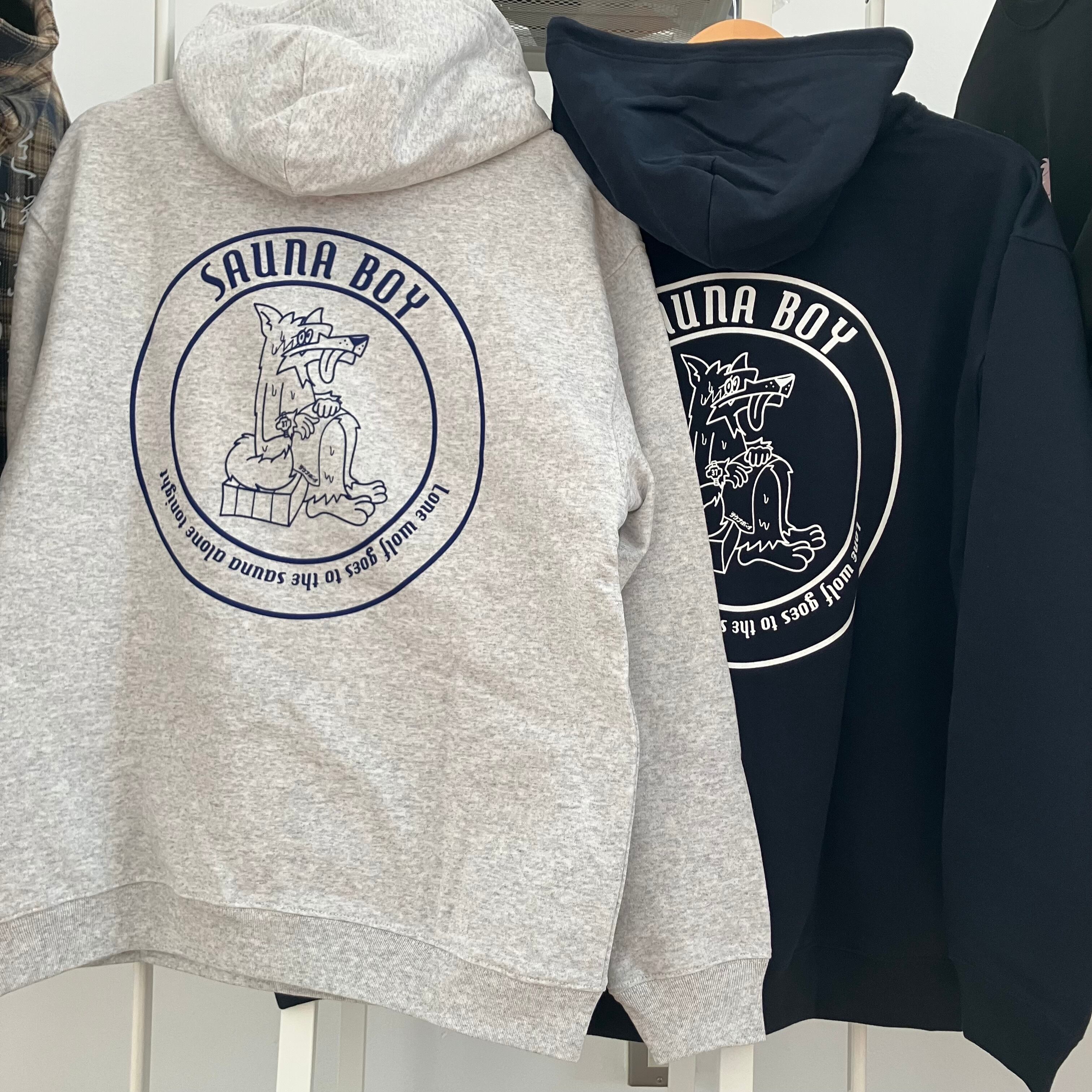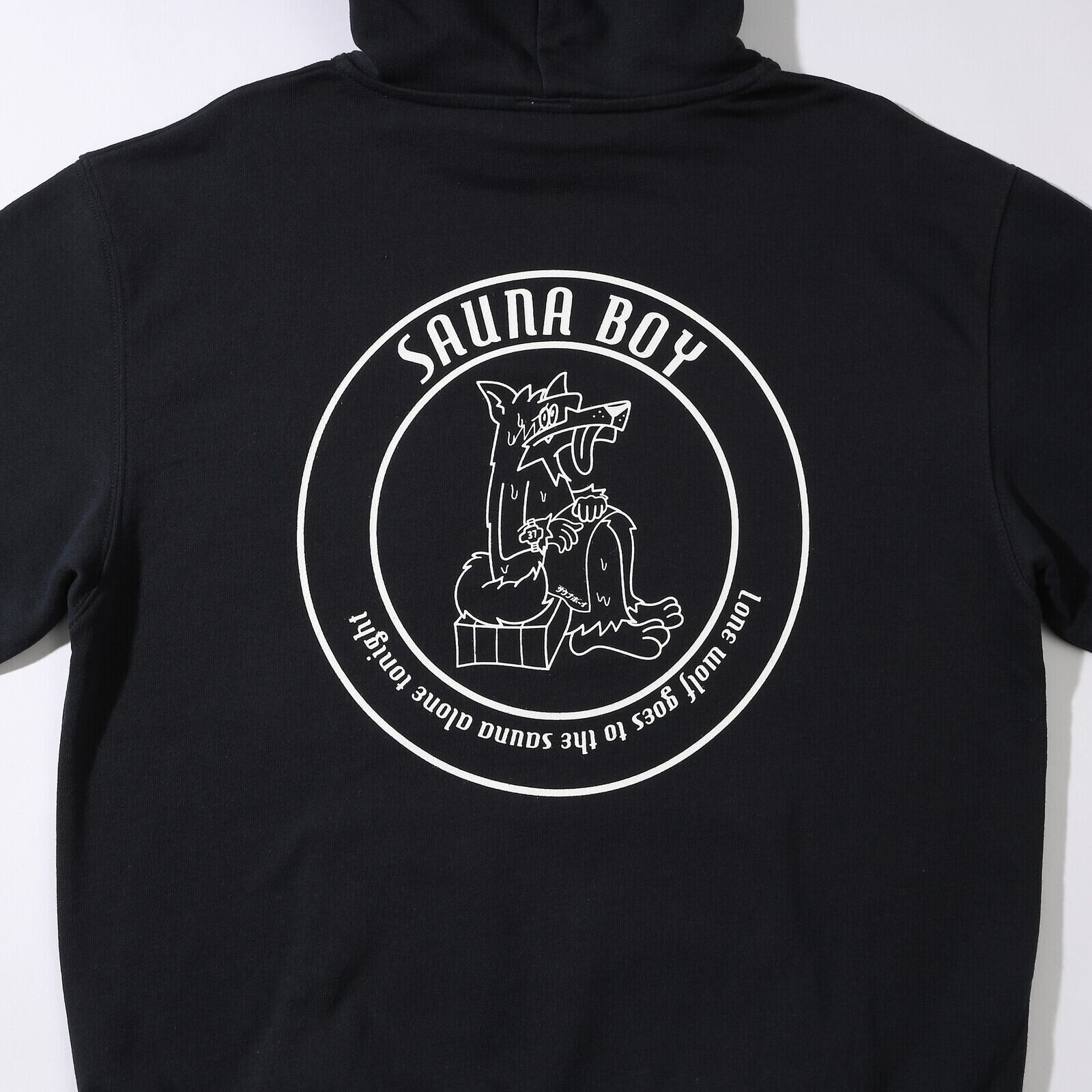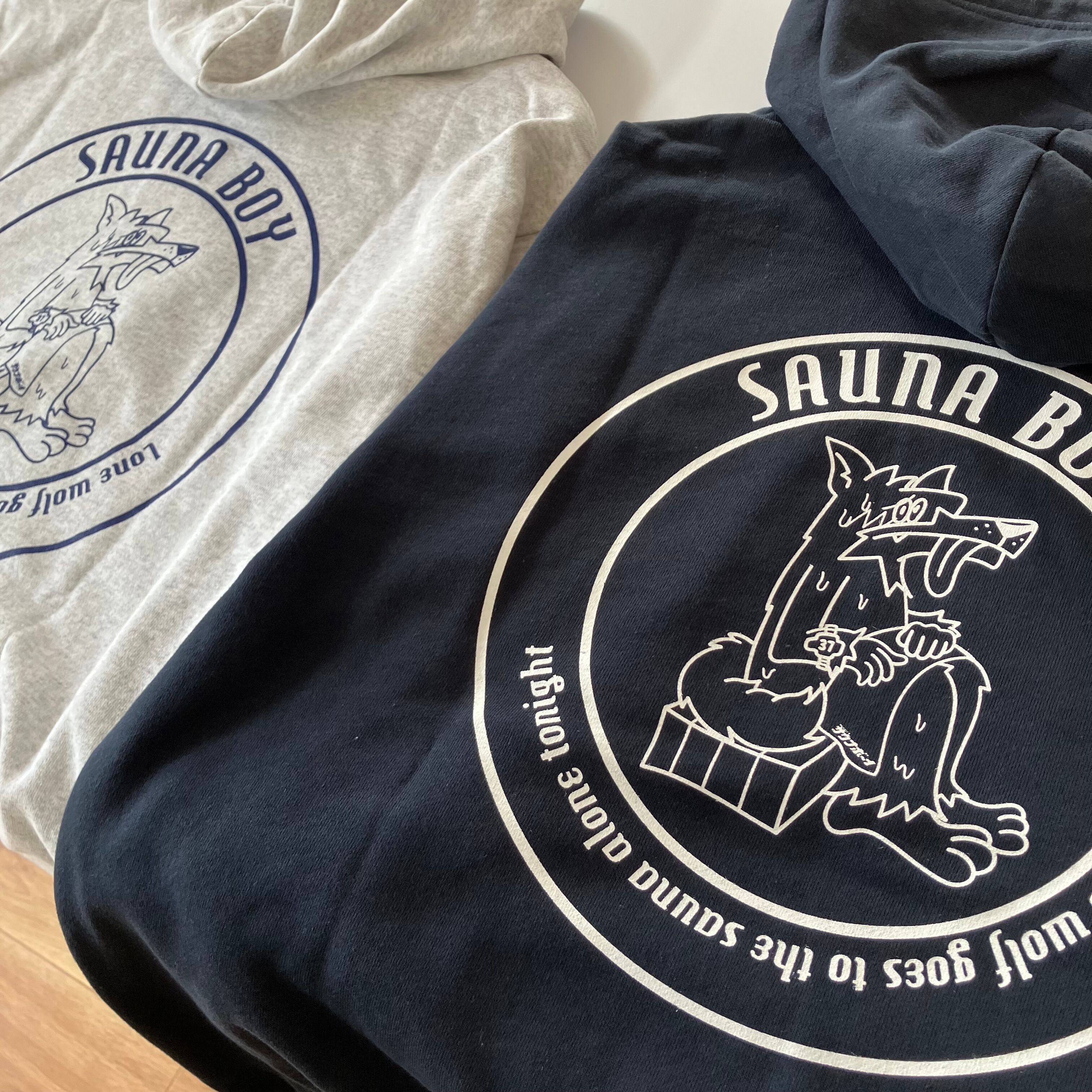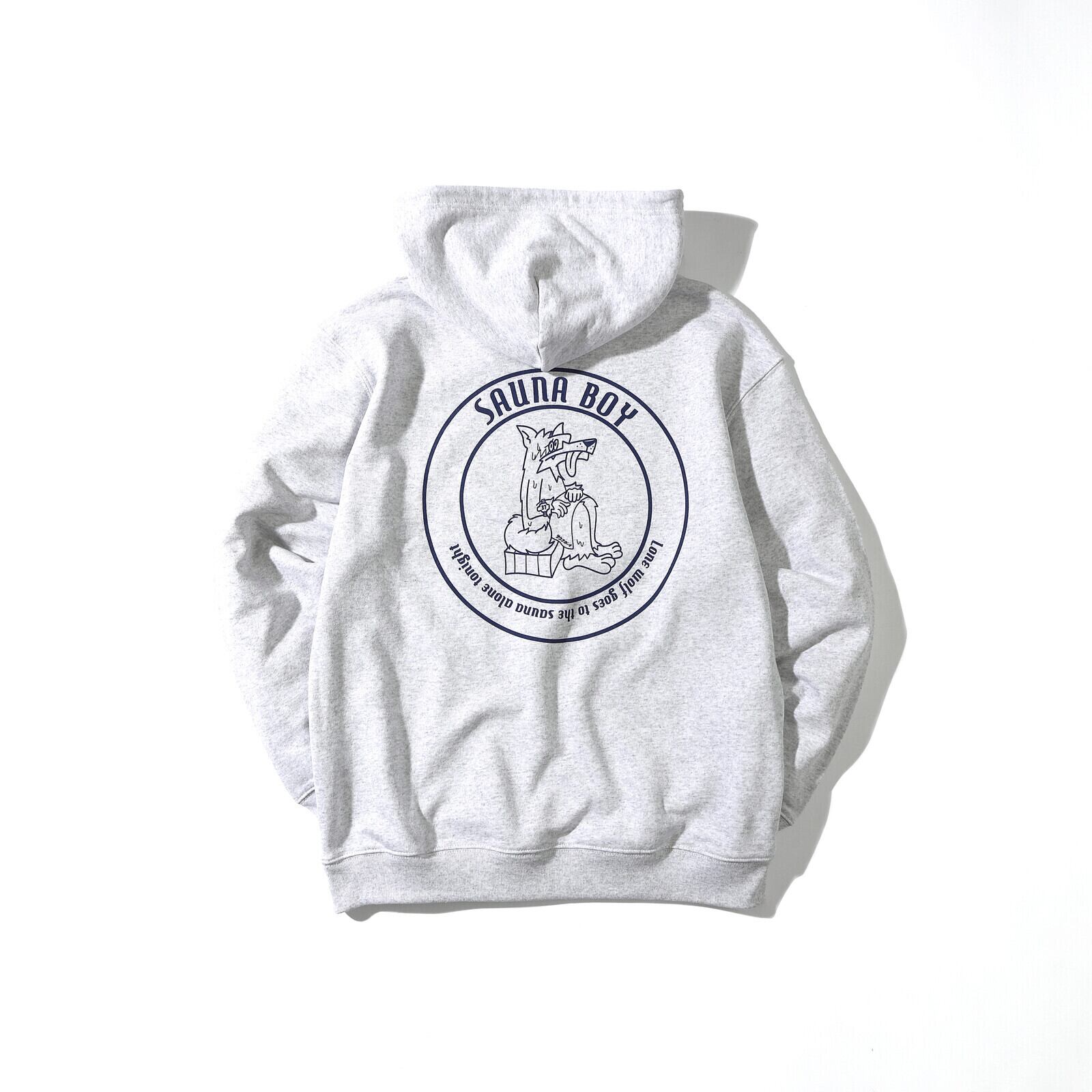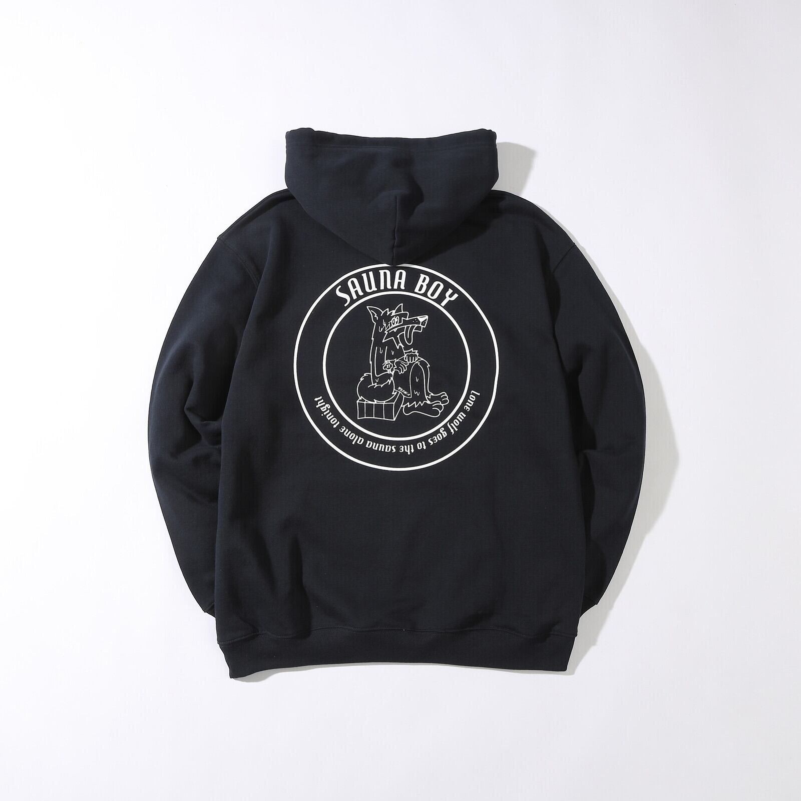 1人でサウナに行くのが大好きな一匹狼のサウナオオカミが、バックに大きくプリントされたスウェットパーカー。