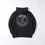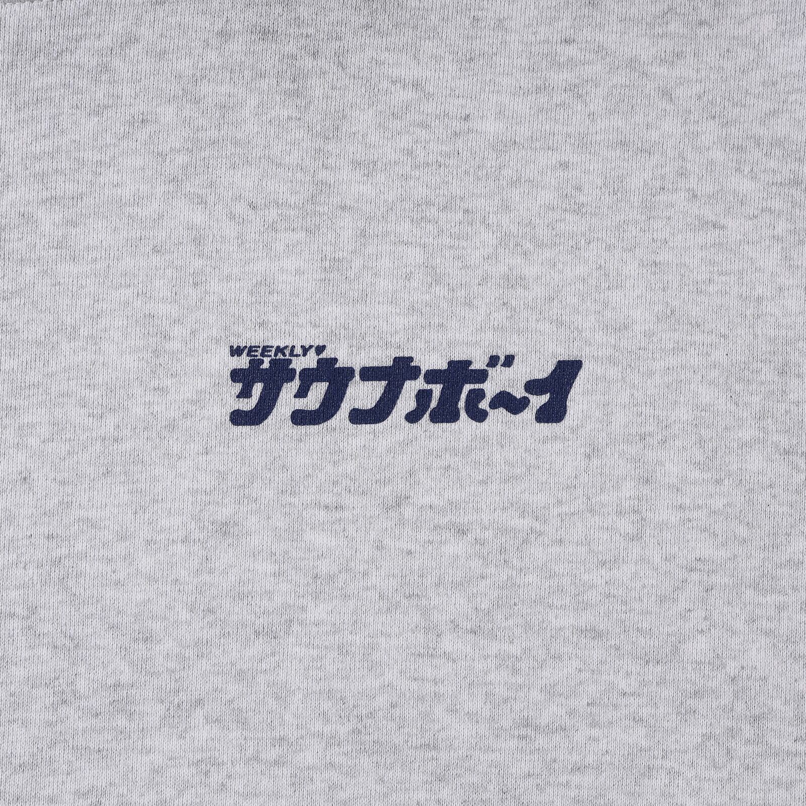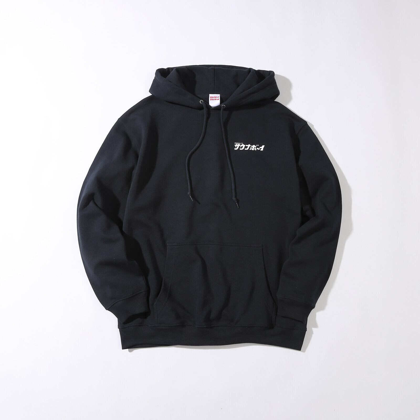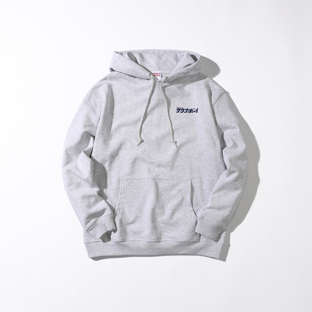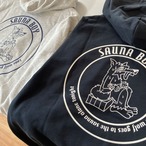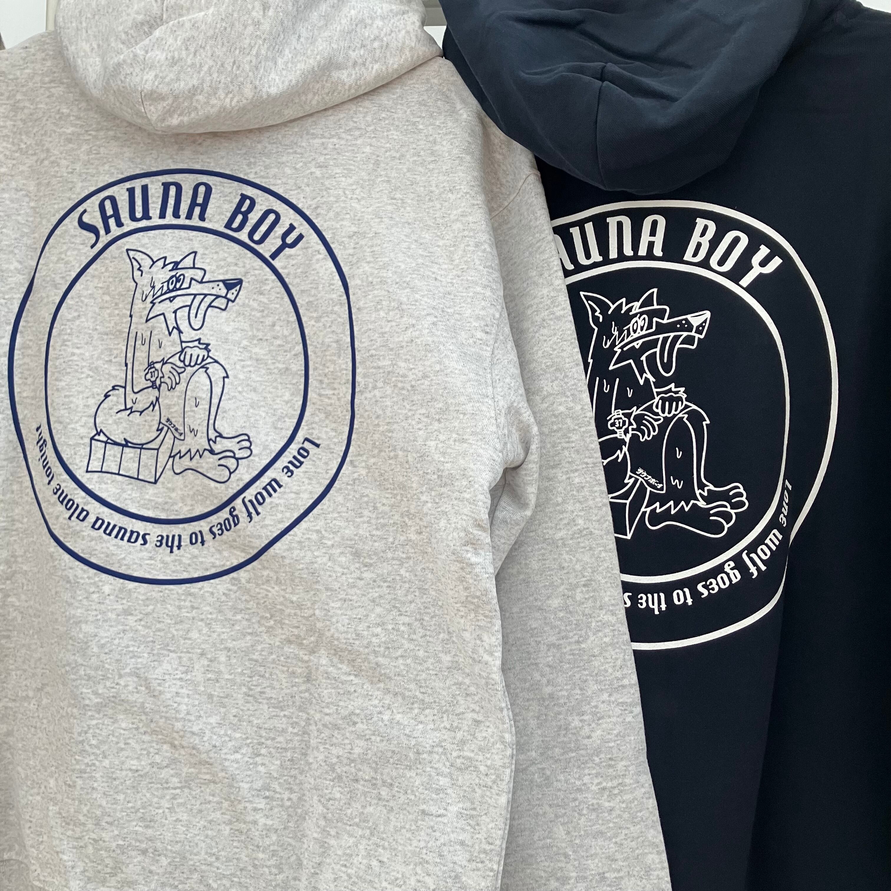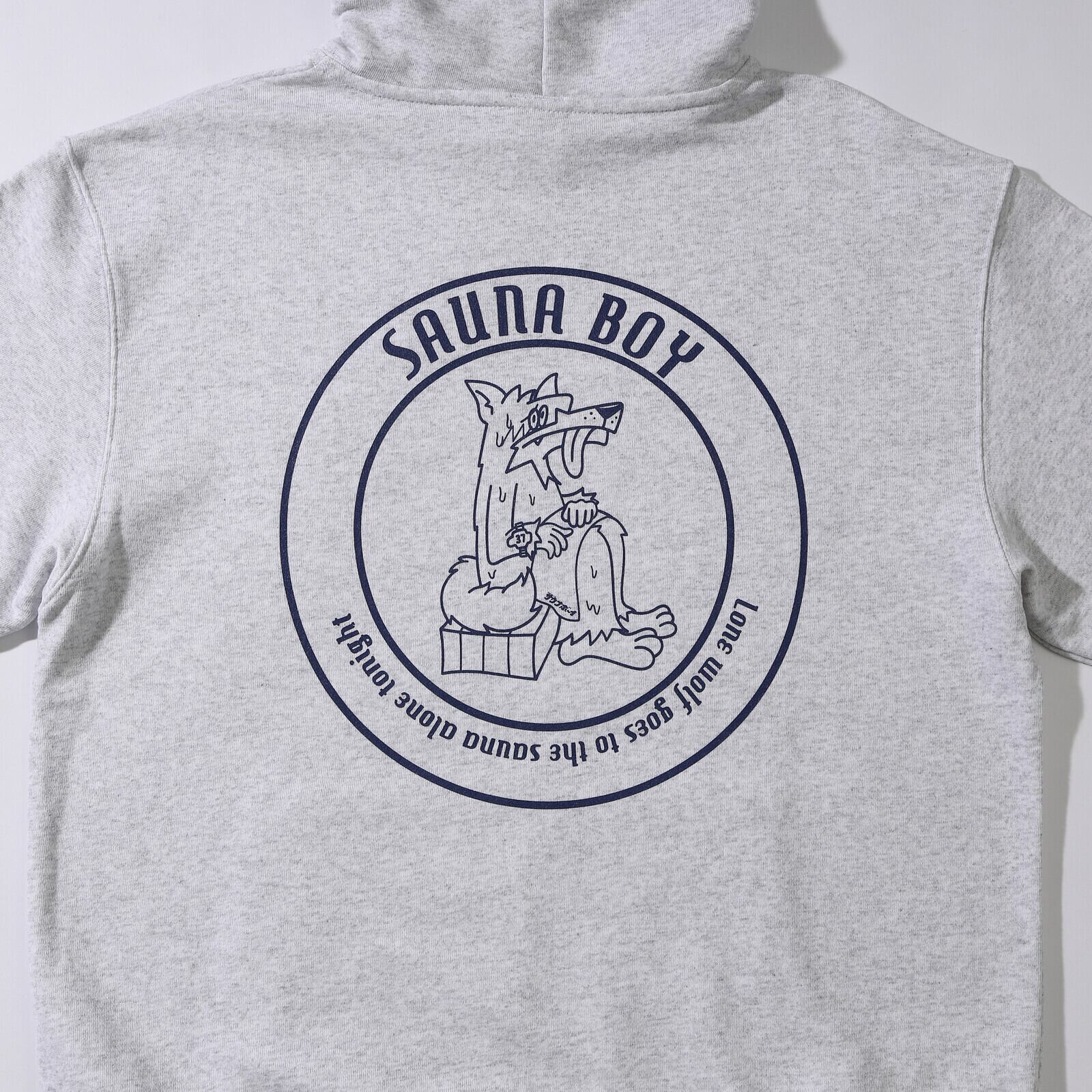 1人でサウナに行くのが大好きな一匹狼のサウナオオカミが、バックに大きくプリントされたスウェットパーカー。