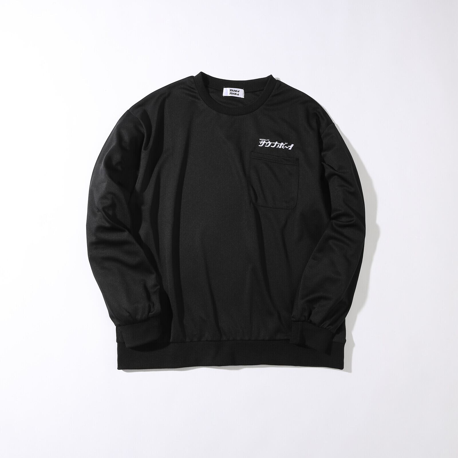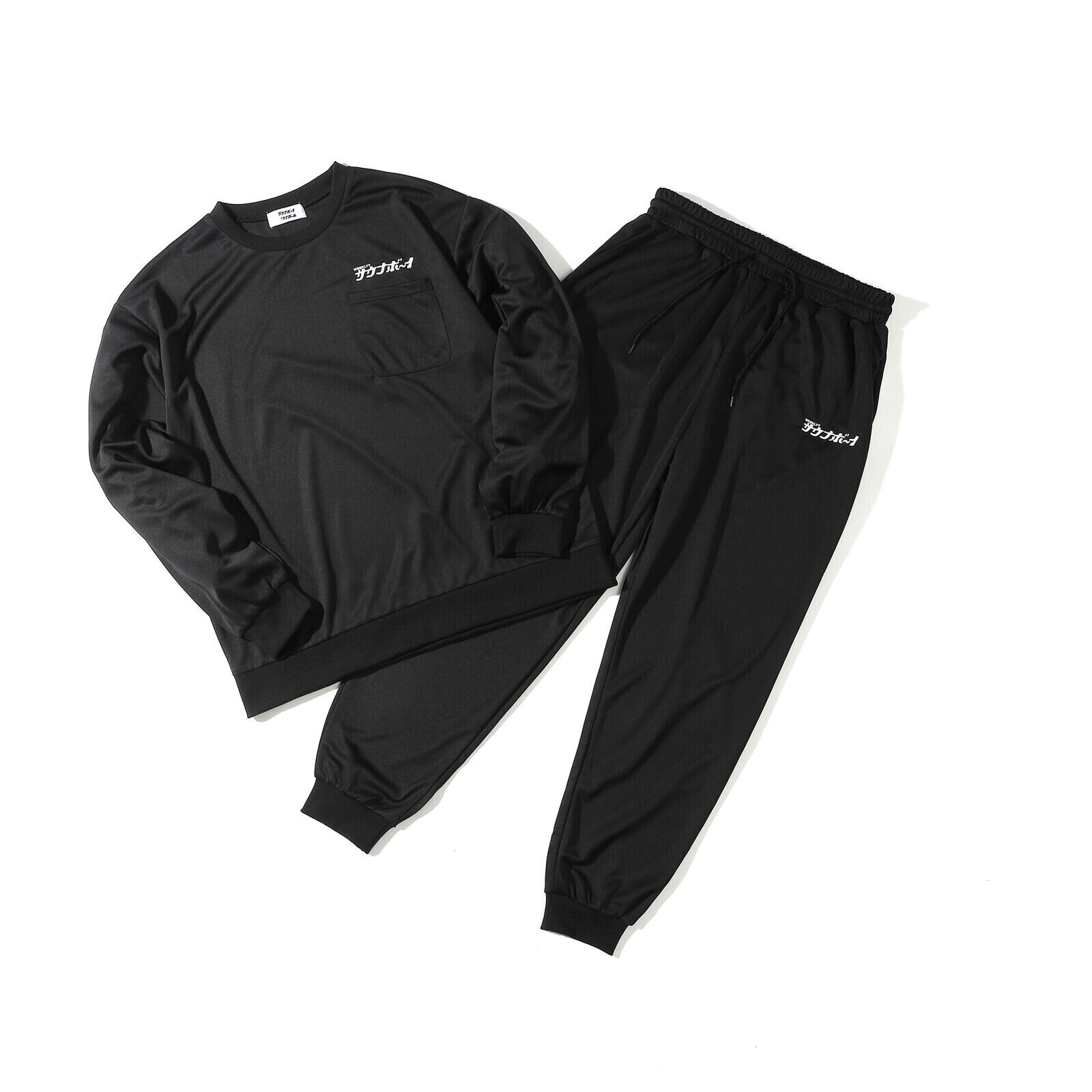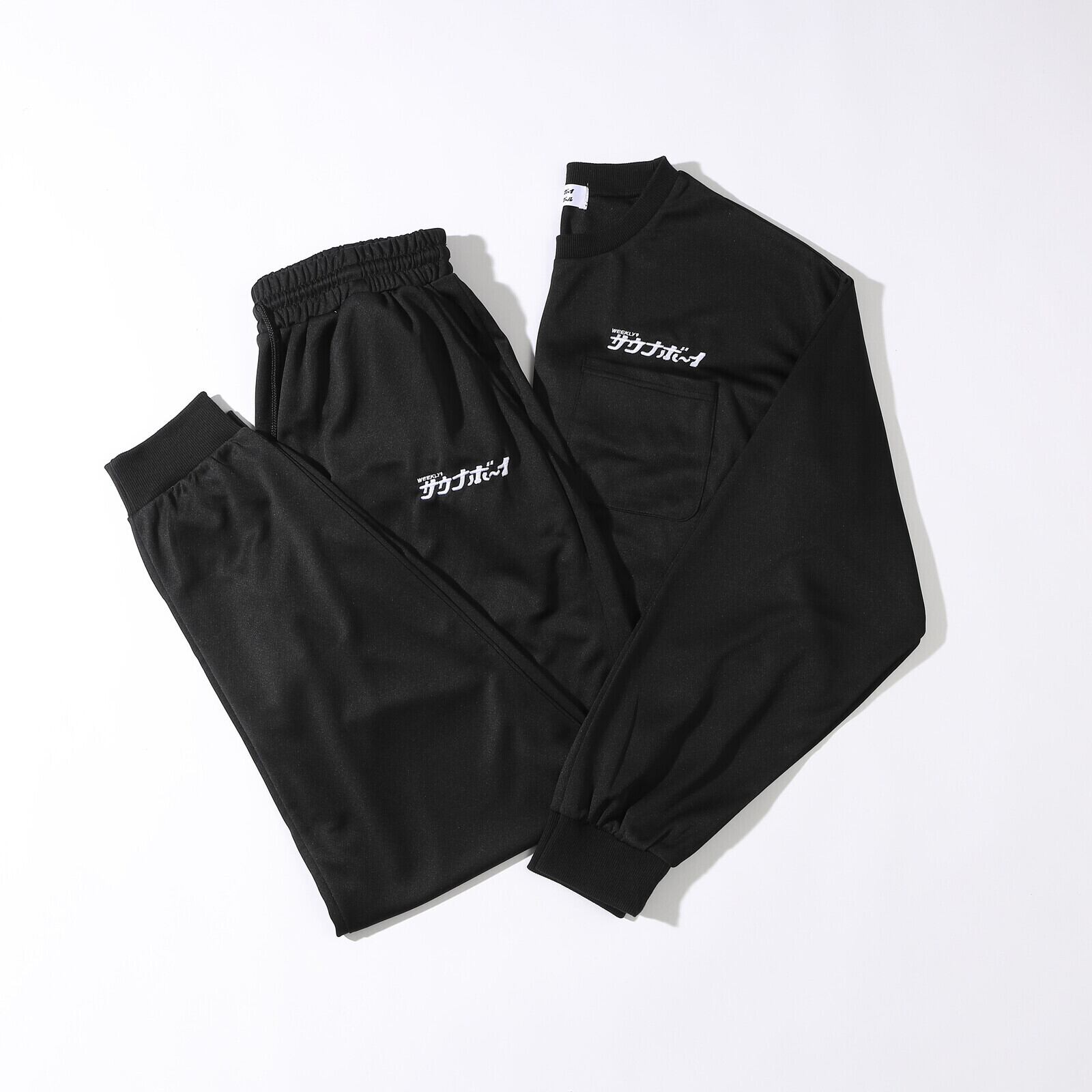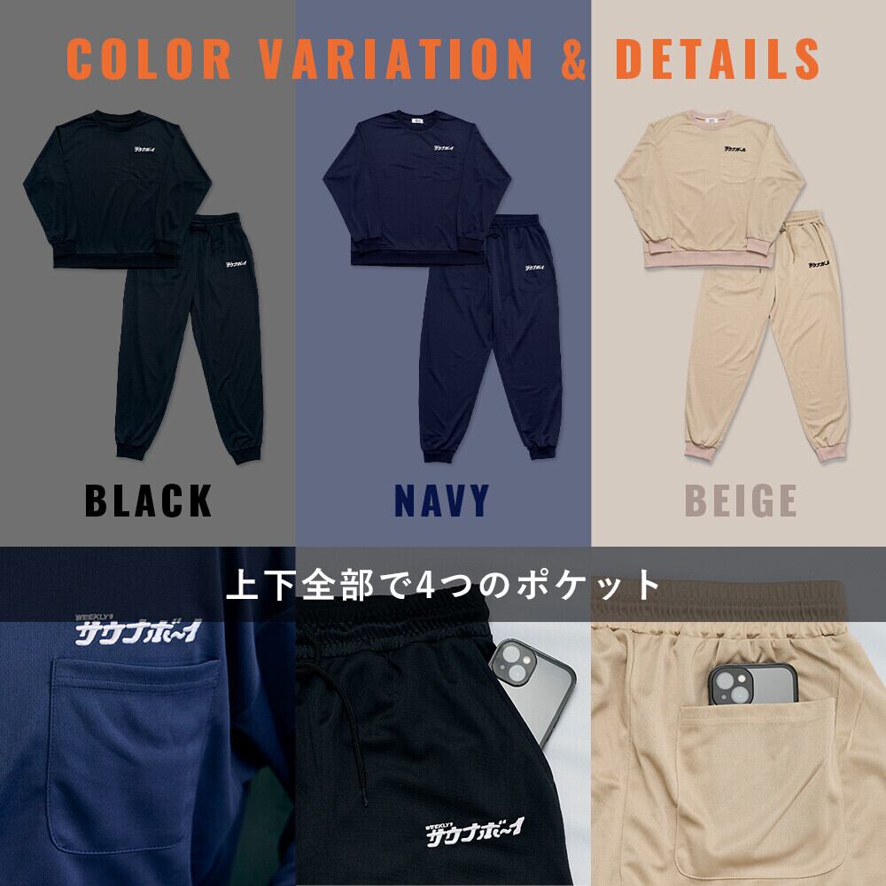 サウナボーイのロゴが刺繍が左胸に配されたデザインがポイントのジャージ素材の長袖セットアップです。