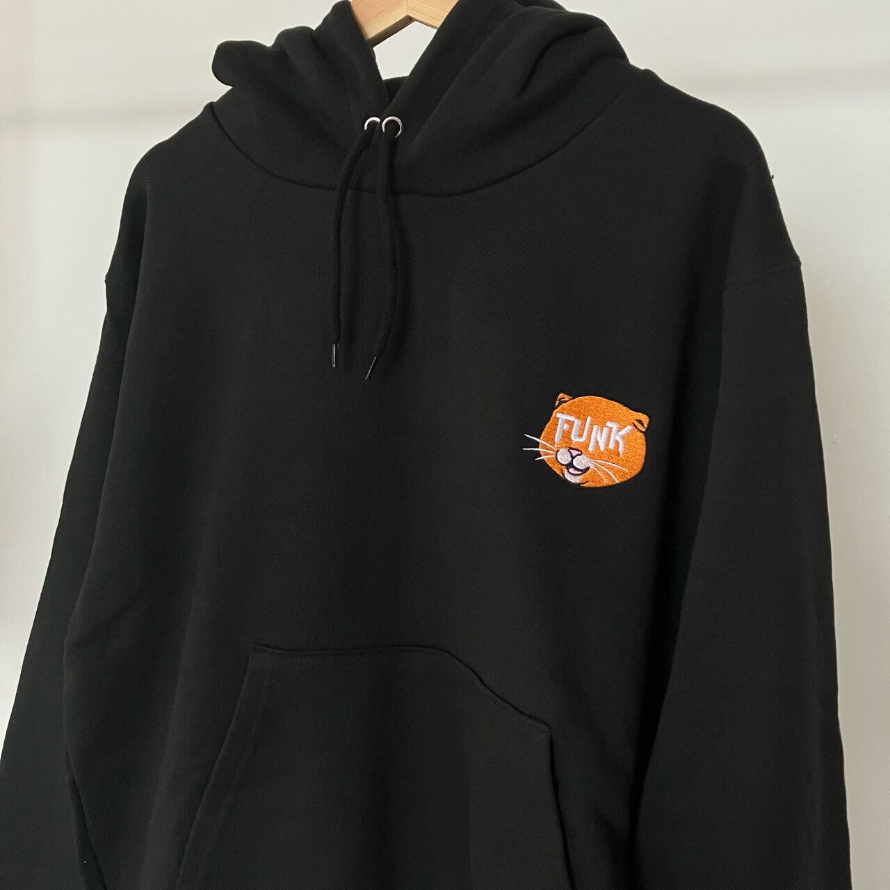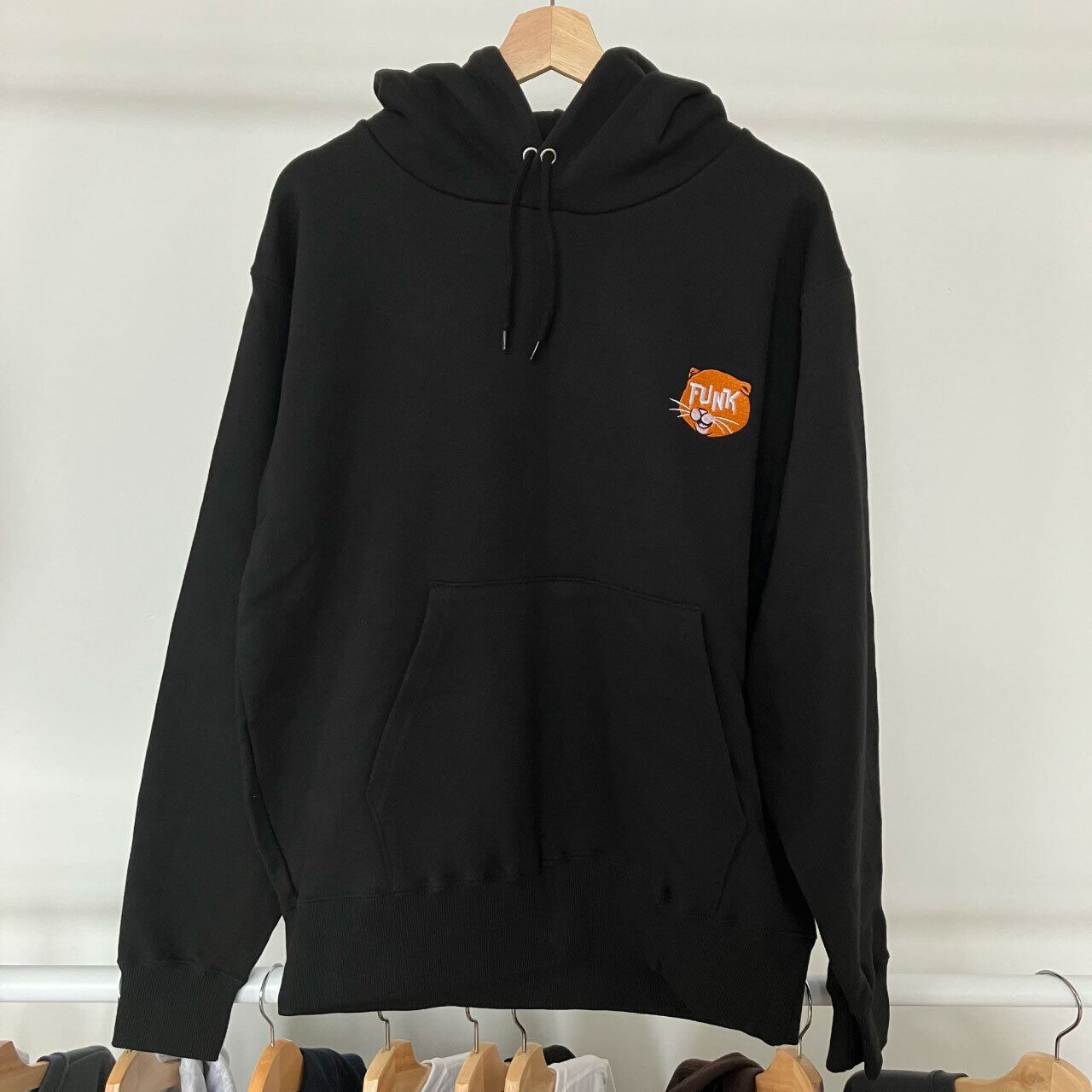 FUNKのCatロゴが刺繍された定番Hoodieです。 Lサイズ 着丈70cm,身幅60cm,肩幅52cm,袖丈63cm,アームホール25cm XLサイズ 着丈73cm,身幅63cm,肩幅55cm,袖丈64cm,アームホール26cm カラー:ブラック 厚み : 10.0 oz 組成 : 綿100% 裏地パイル