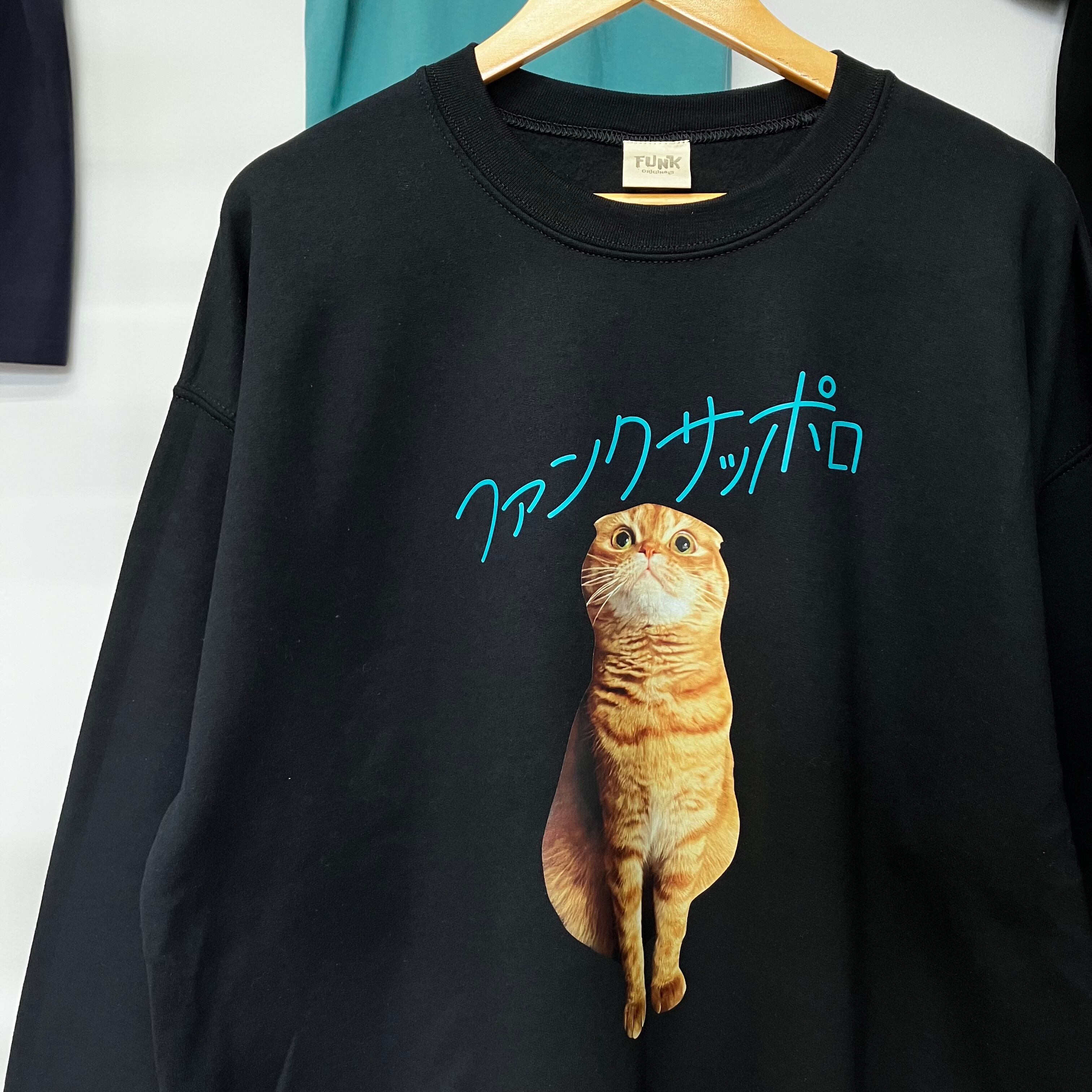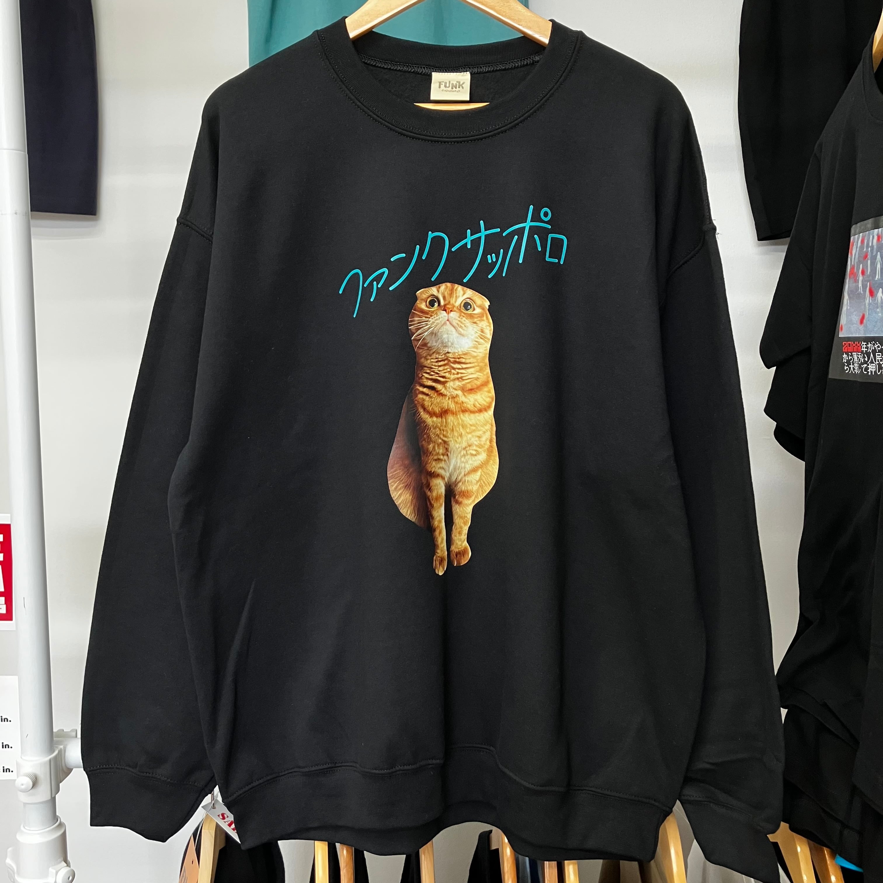 ※4月頭に再入荷予定でございます。 【新色入荷!!!】 FUNK SAPPOROの看板ニャンコ(2歳) がプリントされたスウェットです! かる〜い素材の裏起毛! 着丈76cm,身幅66cm,裄丈93cm カラー:ブラック サイズ:XL ONLY 8.0oz 綿50%、ポリエステル50% 裏起毛